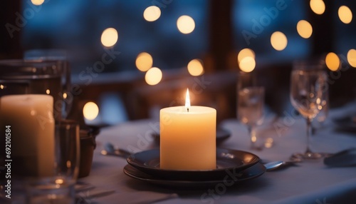 Lit up candle at an outdoor table of a restaurant in winter, cosy atmosphere, selective focus