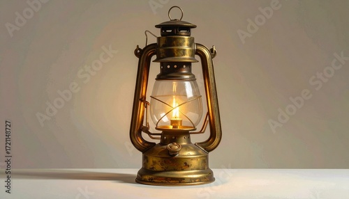 Lit vintage brass kerosene lantern with glass enclosure, showcasing antique lighting and craftsmanship.