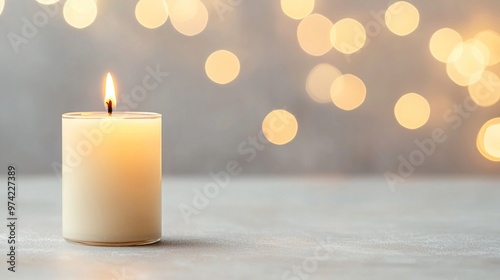 Lit white candle with a soft bokeh background creating a warm and serene ambiance.