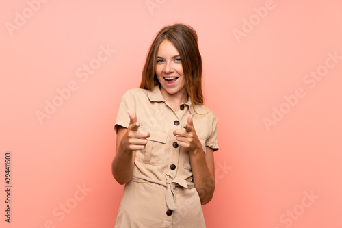 Lithuanian blonde girl over isolated pink background pointing to the front and smiling
