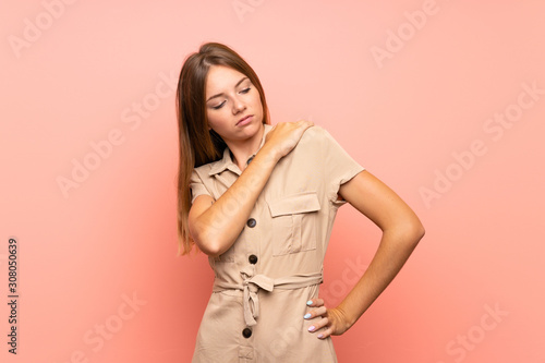 Lithuanian blonde girl over isolated pink background suffering from pain in shoulder for having made an effort