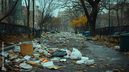 Littered City Park Scene with Trash and Food Wrappers Under Clear Sky