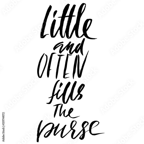 Little and often fills the purse. Hand drawn lettering proverb. Vector typography design. Handwritten inscription.