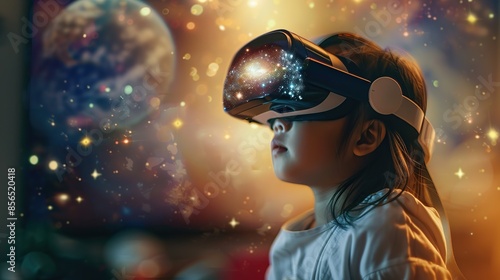 Little asian girl astronomer captivated by wonders of space through holographic VR at home. copy space for text.
