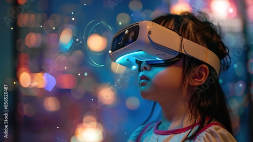 Little asian girl astronomer captivated by wonders of space through holographic VR at home. copy space for text.