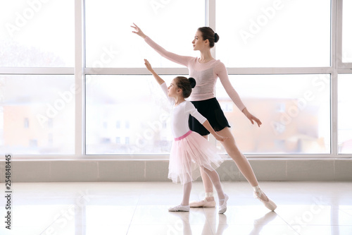 Little ballerina training with coach in dance studio