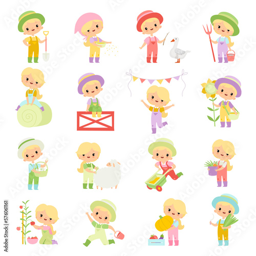 Little Blond Boy and Girl Farmer in Jumpsuit and Hat at Farm Working in the Garden Big Vector Set