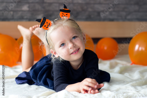 Little blond girl with blue eyes lay on the sofa in Halloween party costume and decorations on background,smile kid celebrating autumn traditional holiday