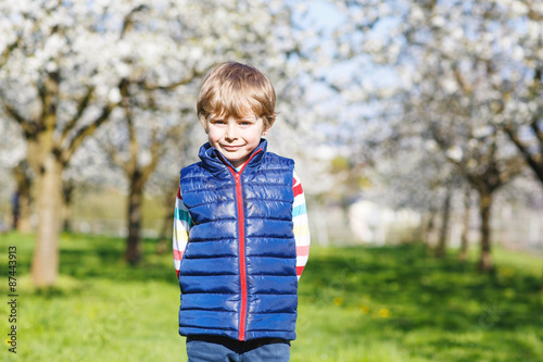 Little blond kid boy having fun on blooming cherry garden