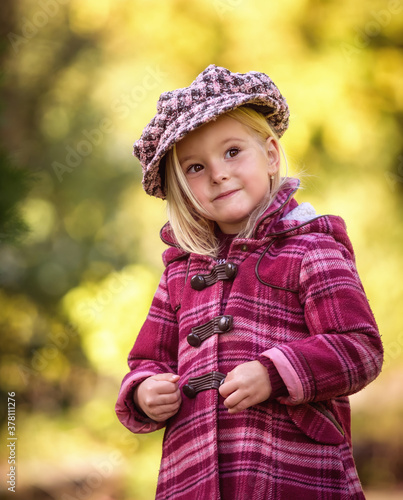 Little blonde girl posing in coat in autumn