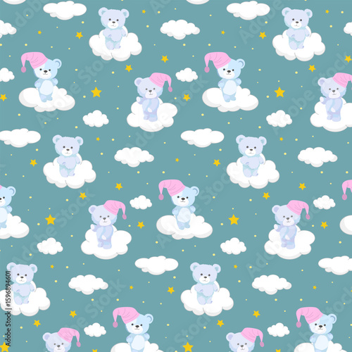 Little blue bears on the clouds.Vector seamless pattern with blue bears on clouds on a colored background with stars. Perfect for children's clothing, bed linen, wrapping paper.
