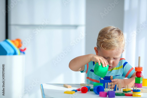 Little boy 2 years old is played with a colors toys. Educational logic toys for children. Montessori games for child development.