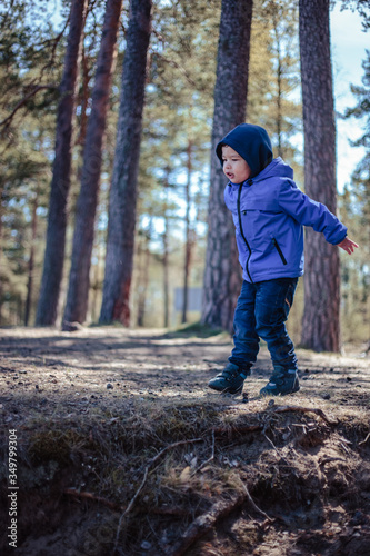 Little boy alone in a spring forest