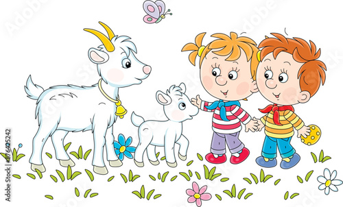 Little boy and girl treating a cute small goatling with a tasty cookie in a flower field on a summer vacation, vector cartoon illustration isolated on a white background