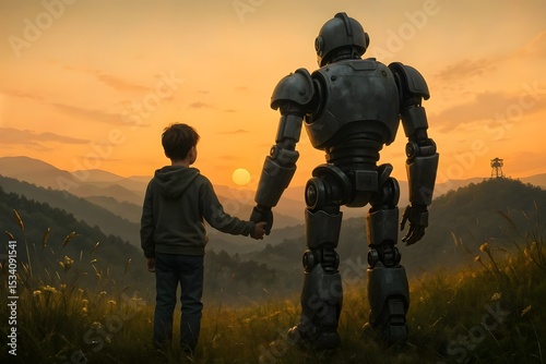 little boy and robot holds hands at sunset in carpathian mountains