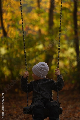 Little boy having fun on a swing on the playground in public park on autumn day. Happy child enjoy swinging. Active outdoors leisure for child in city