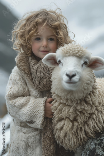 Little Boy Holding Sheep in Snow. Heartwarming Winter Bond. A heartwarming moment captured as a little boy tenderly holds a sheep amidst a snowy landscape.