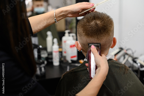 little boy in a mask, which is cut in the barbershop in the barbershop, fashionable and stylish haircut for a child.