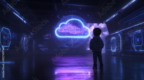 Little boy looking at a cloud hologram on a dark blue background. 3D Rendering
