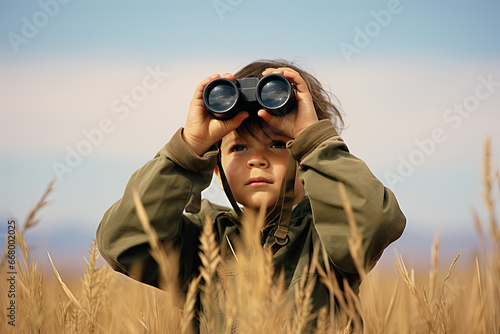 Little boy looking through binoculars in the park. Kid exploring nature
