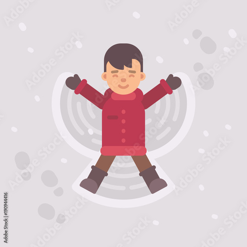 Little boy making a snow angel. Winter kid flat illustration