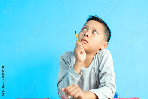 little boy thingking while studying. happy and smart child is looking for an idea.