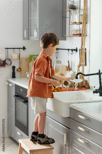 Little boy washing plate in kitchen