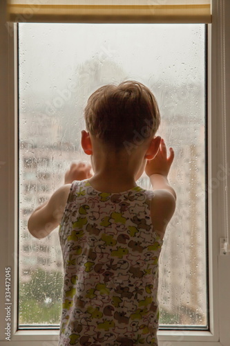 little boy watching the rain through the window. close-up
