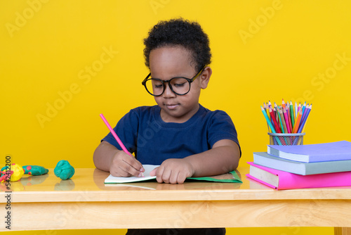 Little boy with imagination Sitting at the table drawing with colored pencils.