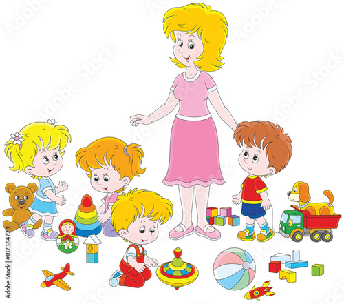 Little boys and girls playing with toys around their young and cute kindergarten teacher, a vector illustration in cartoon style