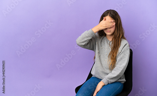 Little caucasian girl sitting on a chair isolated on purple background covering eyes by hands. Do not want to see something