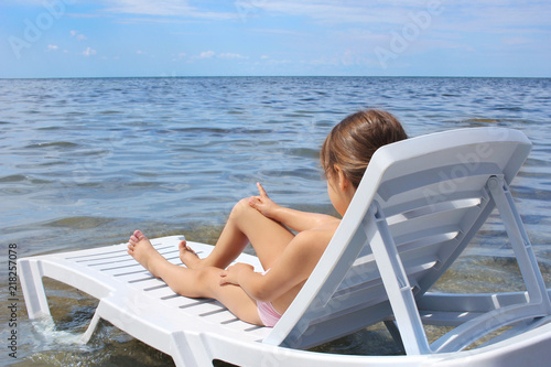 Little child on a deck chair on a sunny day, relaxing on the beach. Girl looking at the sea