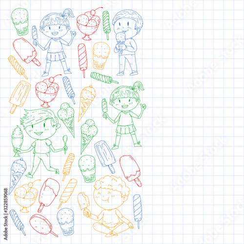 Little children eating ice cream. Summer vacation. Sweet fruit desert.