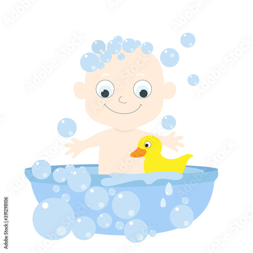 Little cute albino baby bathes in a bathtub with soap bubbles and a yellow rubber duck. The child smiles happily. Cartoon character in flat style isolated on white background.
