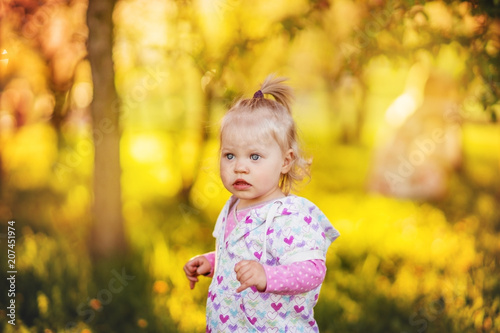 Little cute and cheerful baby girl, blonde girl, walking in a Sunny garden.