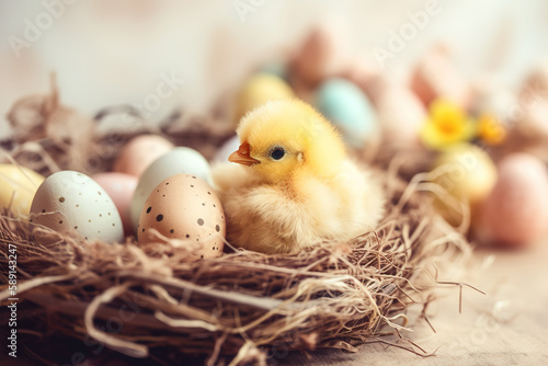 Little cute baby chicks in a bucket, playing at home, yellow newborn baby chicks