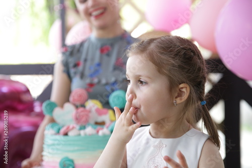 little cute girl eats hand cream from a beautiful cake for her three year birthday