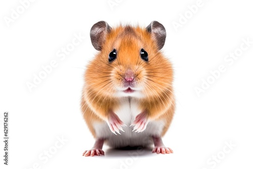 Little cute isolated small hamster sitting on white background. Closeup shot
