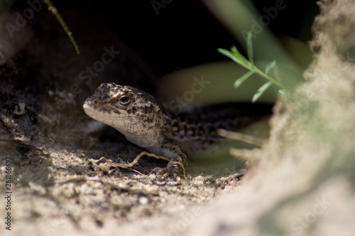 Little cute lizard in his hole on a sand