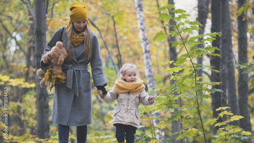 Little daughter with her mother and Teddy Bear walking in autumn park