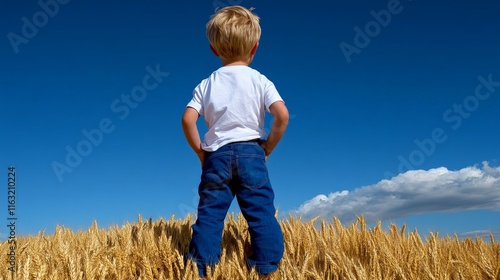 Little Dreamer: A young boy stands tall in a golden wheat field, his back to the camera, gazing up at the boundless blue sky. His posture speaks of wonder, ambition, and a heart full of dreams.