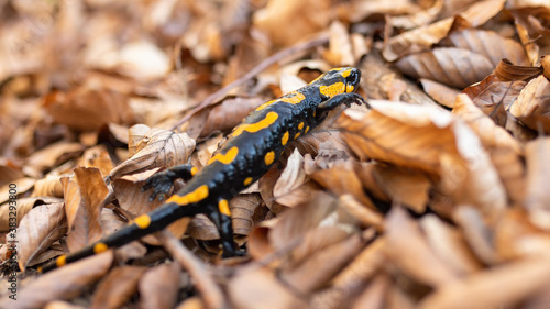 Little fire salamander, salamandra salamandra, moving on leafs in autumn. Dark reptile with orange stripes crawling on foliage. Small animal walking on the ground.