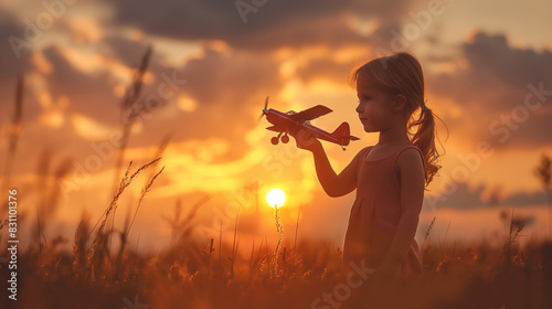 little girl against sunset with toy plane her hand. Girl with toy airplane in her hands