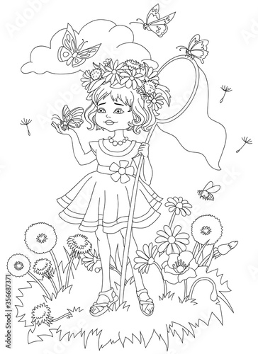 Little girl catches butterflies. Coloring book on white background for children. Cartoon vector illustration.
