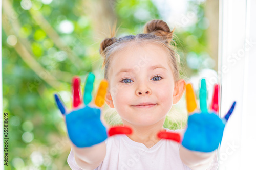 Little Girl featuring painted hands Concept Education, School, Creativity Selected Focus. High quality photo