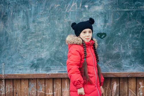 Little girl in autumn park stands at the school board.