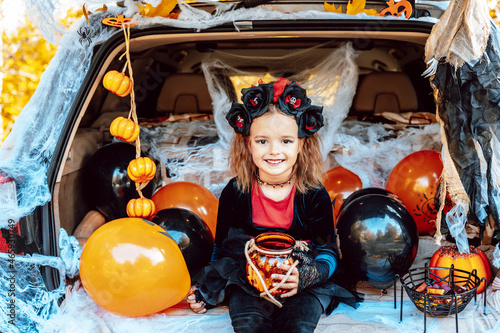 little girl in spooky costume and hat with bucket of sweets and cute poodle dog in ghost costume sits in trunk car decorated for Halloween with web, orange balloons and pumpkins, outdoor creative