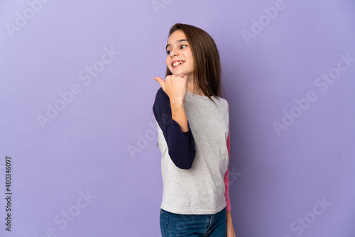 Little girl isolated on purple background pointing to the side to present a product