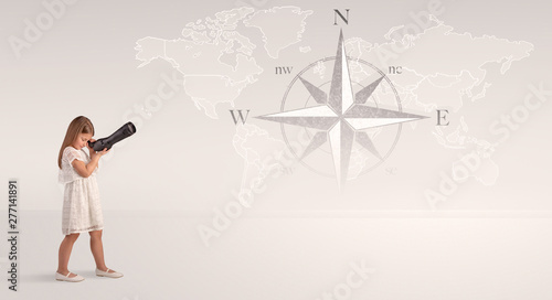 Little girl looking through spyglass to map and compass concept