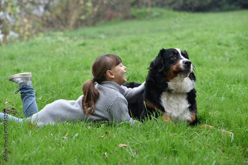 little girl play with dog in the park